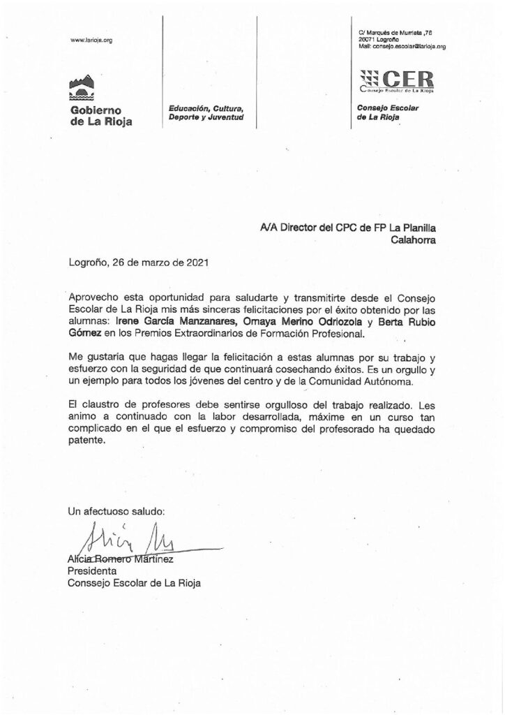 Además hemos recibido del Consejo Escolar de La Rioja una felicitación oficial reconociendo nuestra labor y felicitando a las alumnas, agradecemos sus palabras las cuales publicamos en esta entrada.